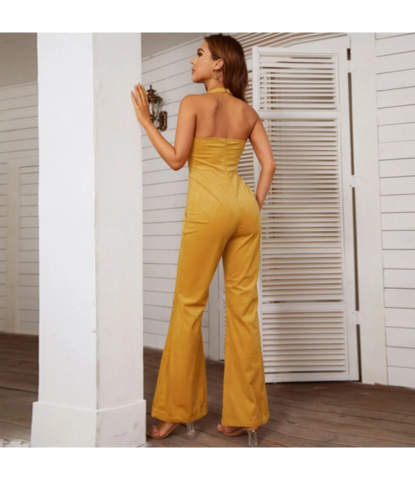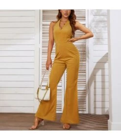 Be the first to review “Fashion Sleeveless Halterneck Zip Open Back Casual Solid Color Flares Loose Wholesale Jumpsuits” Cancel reply