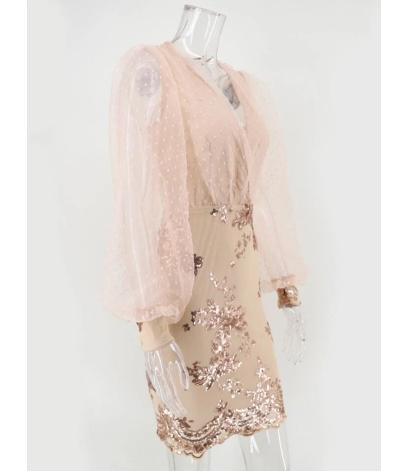 MESH SLEEVE V-NECK SEQUINS STITCH