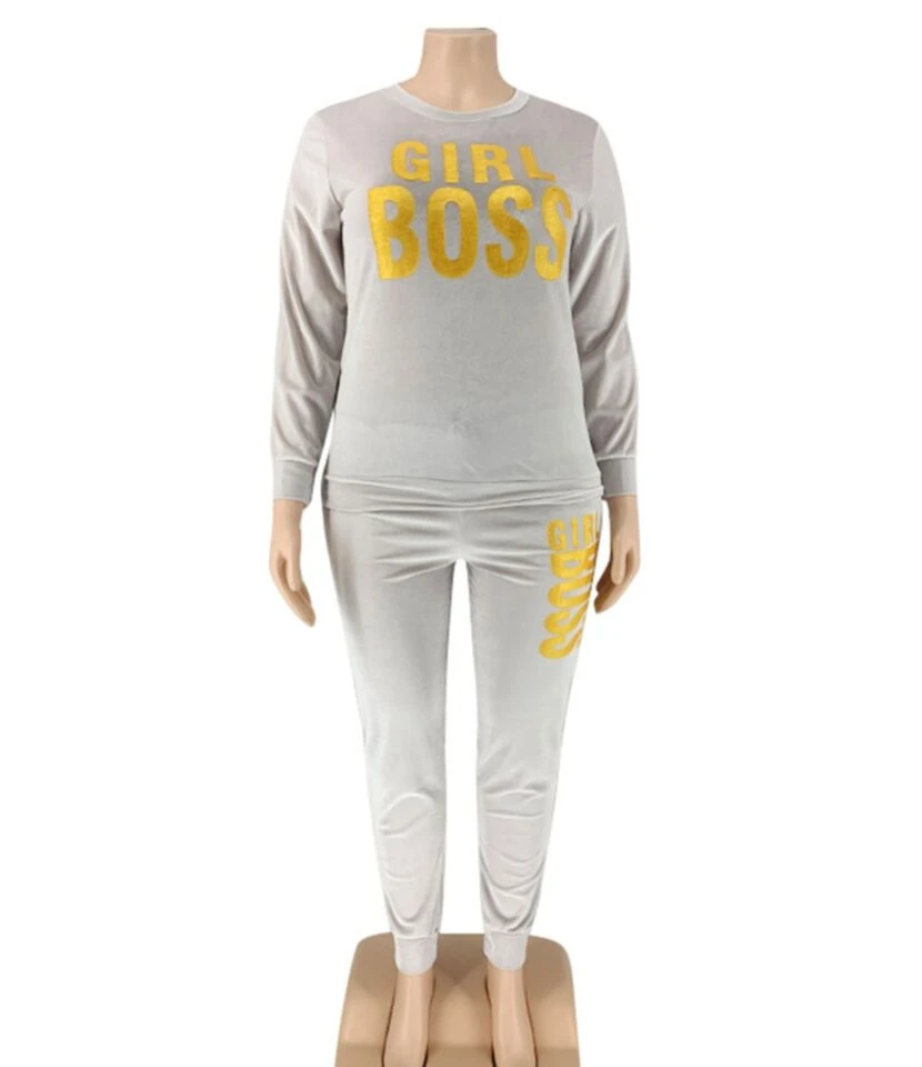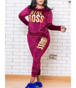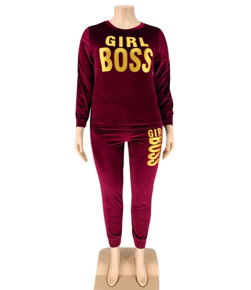 WHOLESALE PLUS SIZEÂ TWO PIECE SETS BOSS GIRL VELVET TOP MATCH DRAWSTRING PANTS OUTFIT