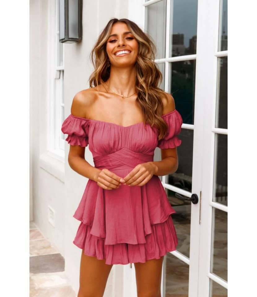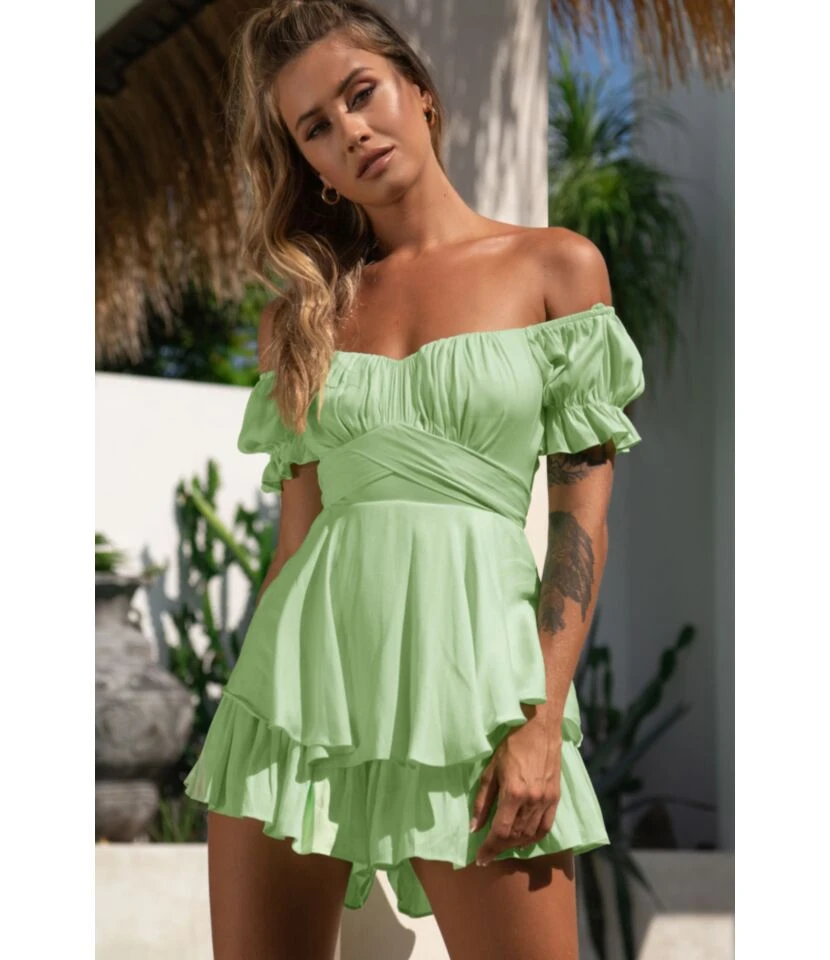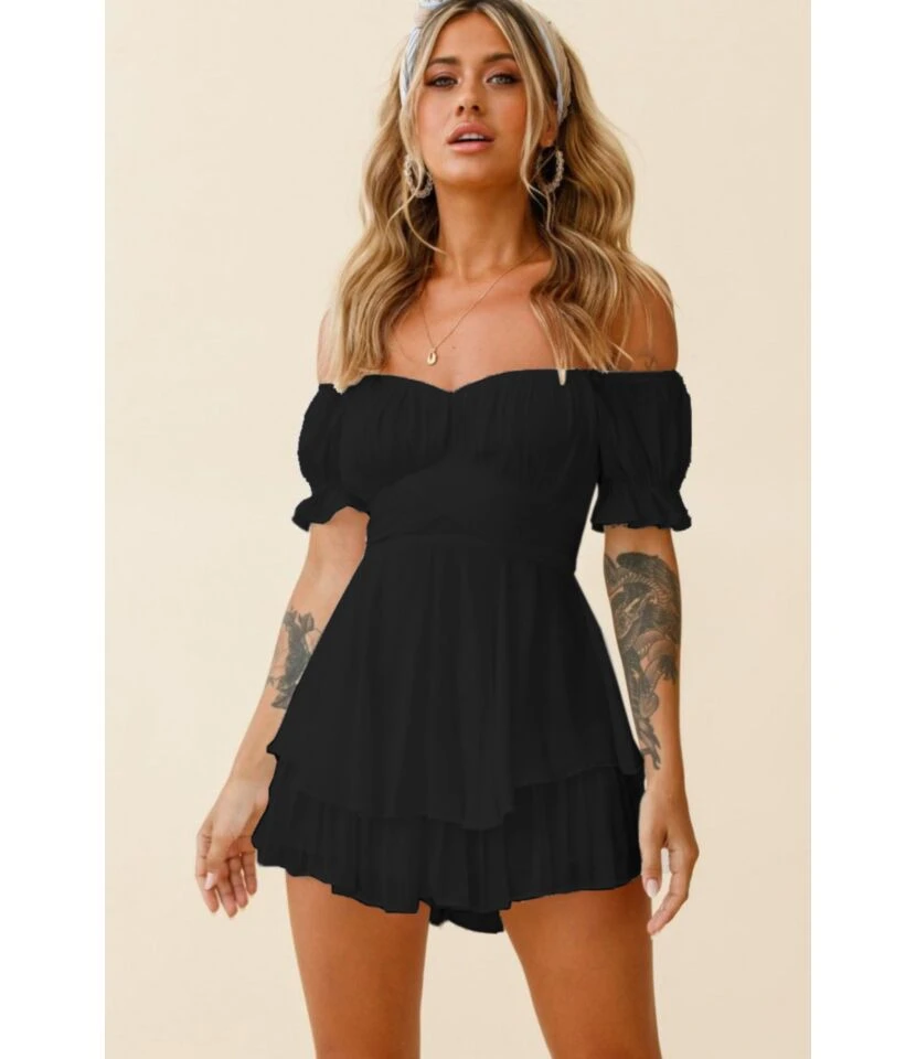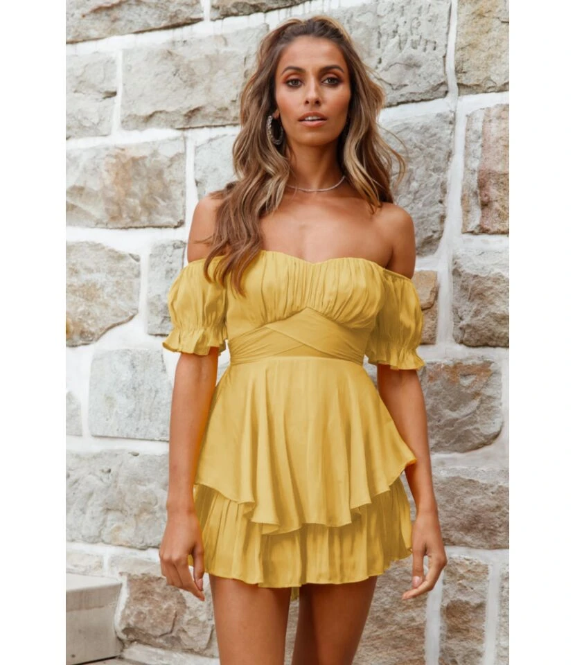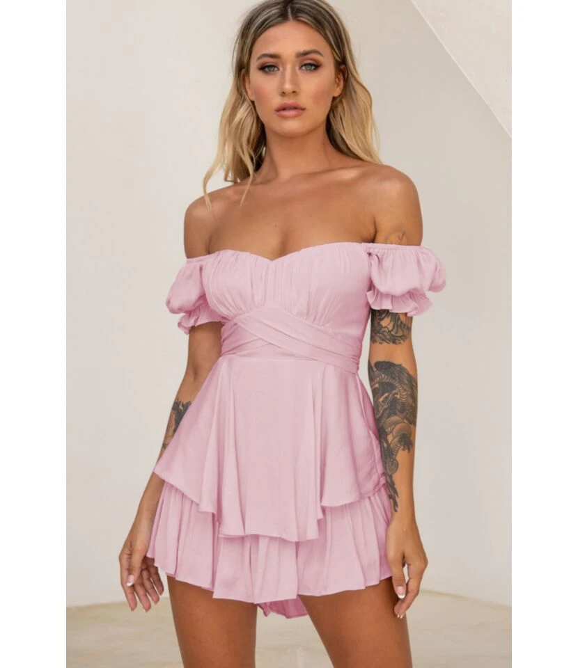 Be the first to review “Solid Color Off Shoulder Puff Sleeve Sexy Ruffles Tie-Up Tube Top Womens Short Jumpsuits Wholesale Rompers SJN533116” Cancel reply