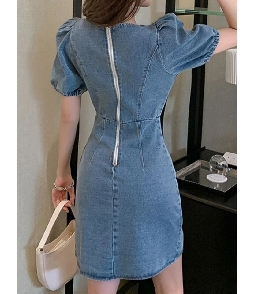 Square Collar lantern Sleeve Elastic Cuff Surplice Bottom Denim Dress