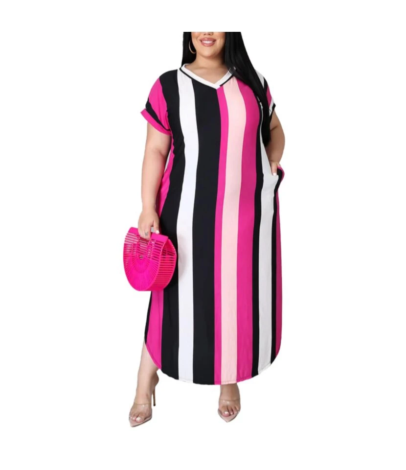 This V-neck striped plus-size maxi dress is so colorful and adorable. No one can opt for a better option than this casual wear. The colorful striped print in a combo of black and pink color adds a mesmerizing effect by making it look bright and pleasant to look at. The round bottom adds a sweet look slightly up from the sides. This sassy V-neck will never let you regret your choice. This outfit is for sure providing you with a slimmer effect as it covers your body perfectly from head to toe. Wear it with a pair of strappy high heels and some light jewelry like a pair of long earrings, and a bracelet, or a gold or silver wristwatch. This summer outfit is made in a loose-fitting so that it will not be clingy and maintains your body temperature by keeping it in equilibrium. Try not to tie your hair tightly instead go for an open hair option. Make some loose curls and let them free.